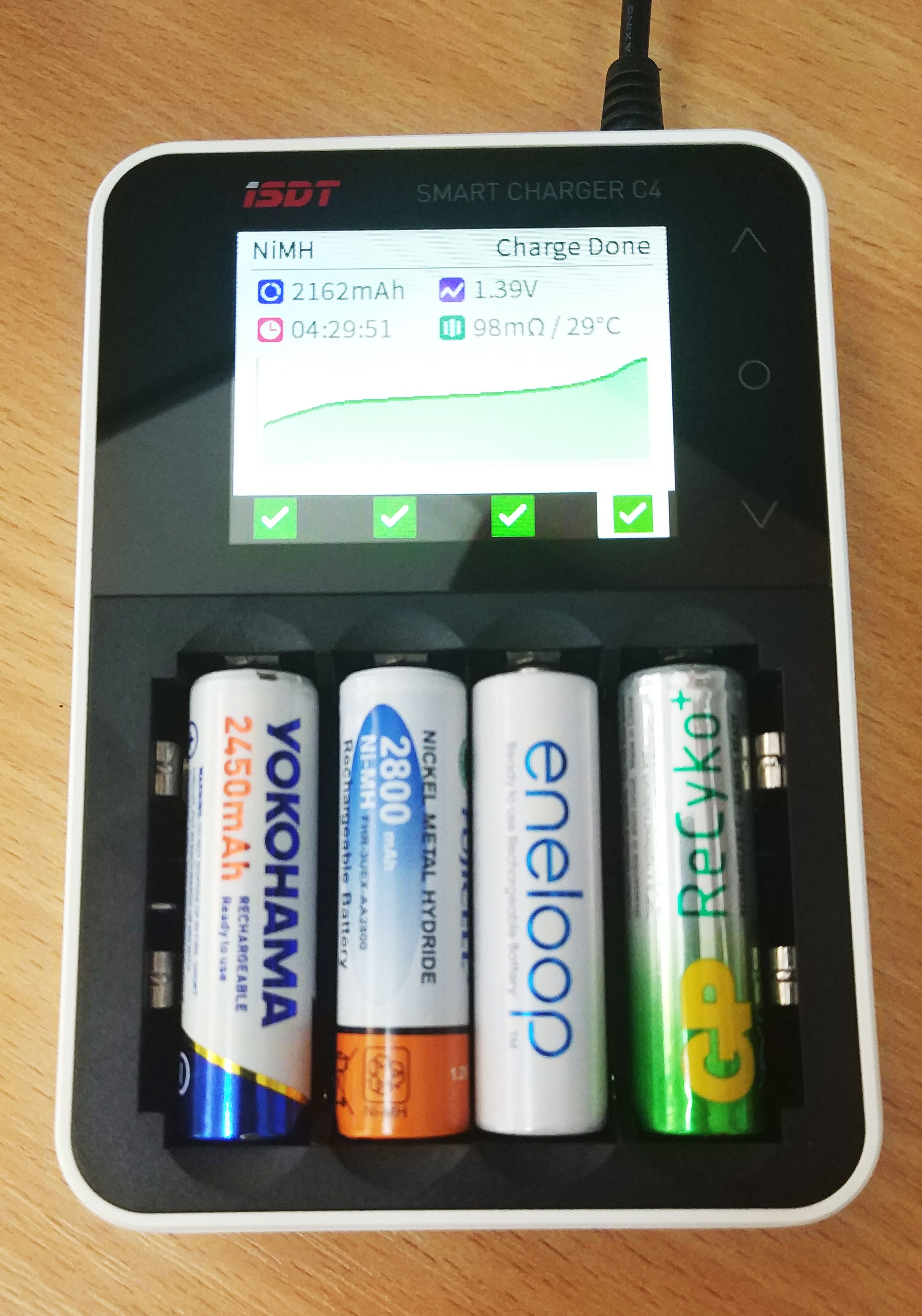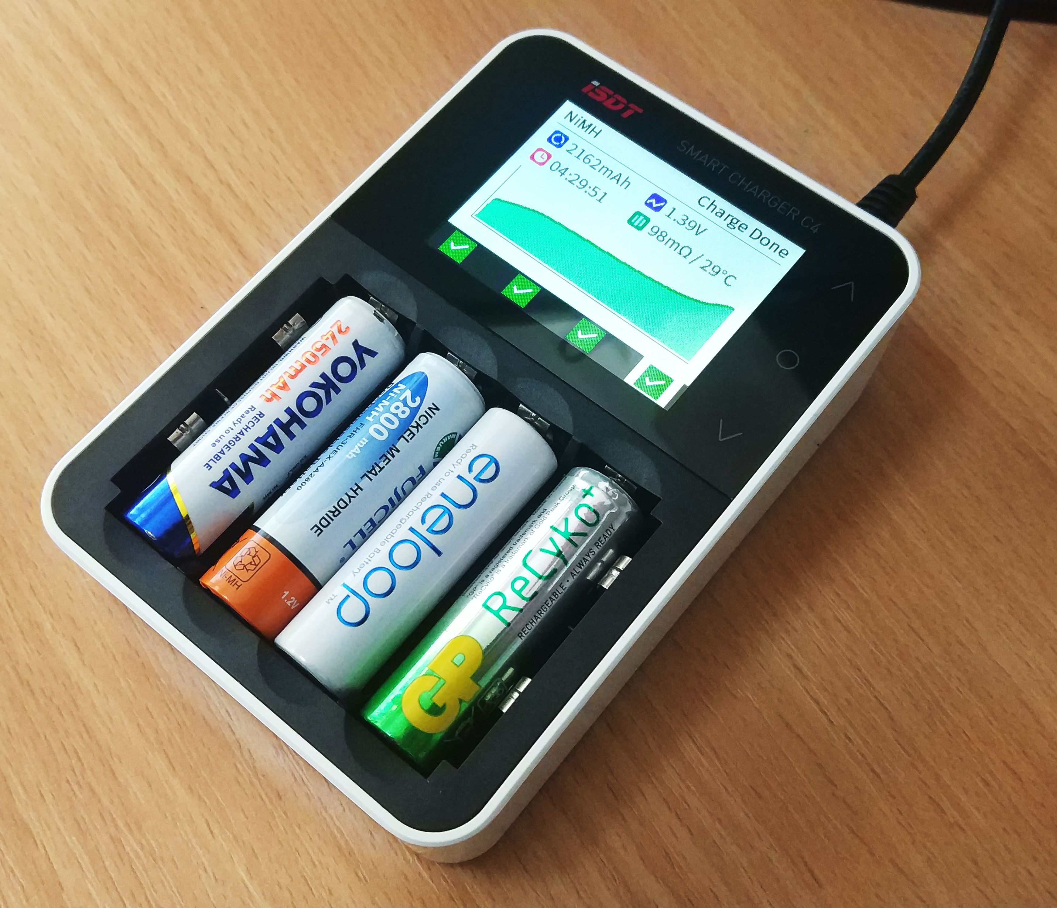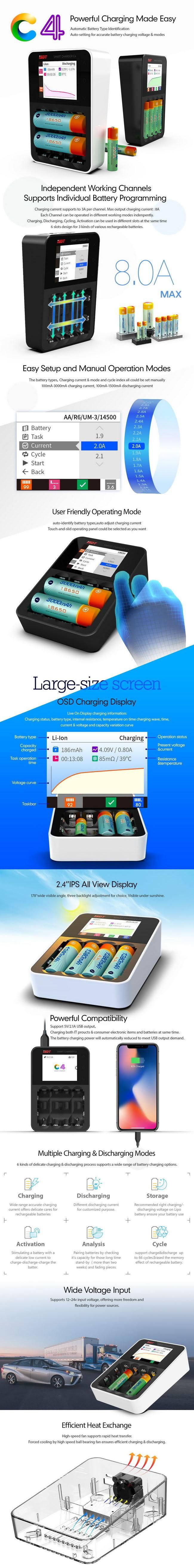 ISDT C4 je univerzalni punjač sa 3A po ležištu koji omogućava punjenje i pražnjenje različitih vrsta baterija, uključujući NiMH, NiCd, NiZn, Li-Ion, LiHv i LiFePO4. Dizajniran za jednostavnu upotrebu sa širokim LCD ekranom i touch tasterima, ISDT C4 može puniti 1-4 ćelije i podržava razne veličine baterija. Automatsko prilagođavanje napona, hemije i struje punjenja omogućava brzo i efikasno punjenje, dok USB izlaz omogućava i punjenje drugih uređaja. Punjač takođe poseduje razne zaštite kako bi se sprečilo pregrejavanje, prepunjavanje i sl. Ukratko, ISDT C4 je visokokvalitetan i funkcionalan punjač koji pruža sve što vam je potrebno za efikasno punjenje i pražnjenje baterija.