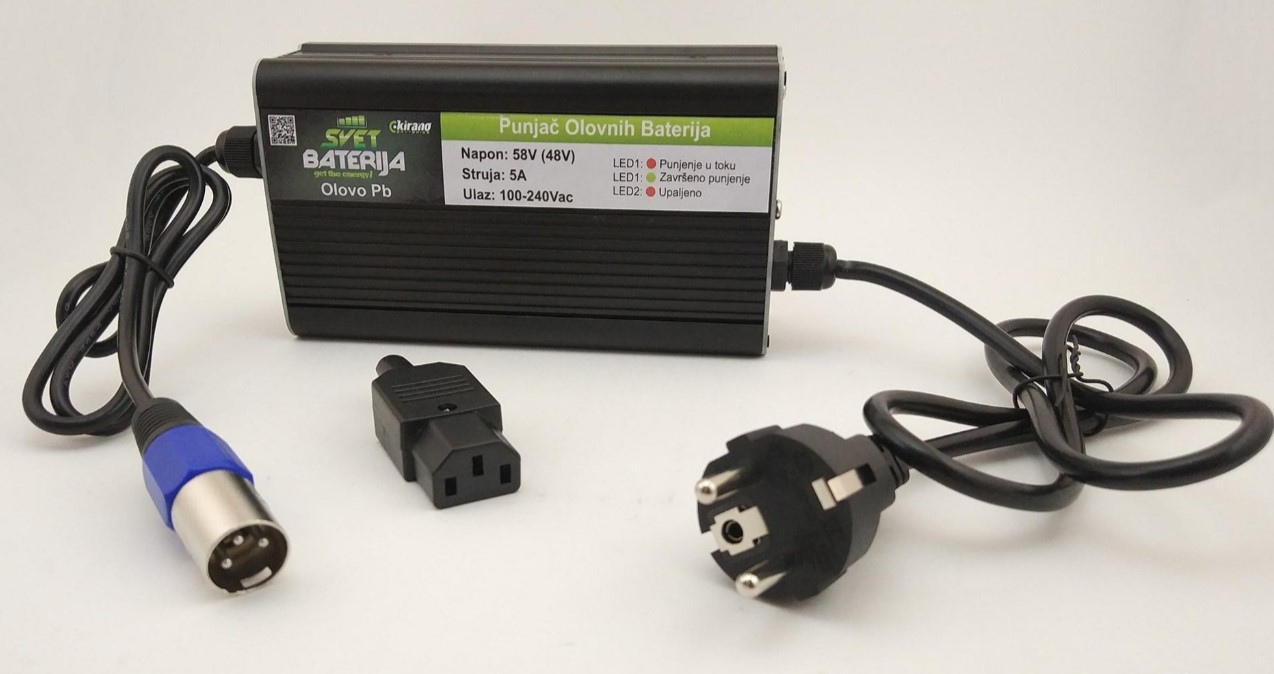 KIRANO punjač sposoban da puni paket baterija 48V strujom od 5A električna vozila, električni bicikli električni trotinet, trotiko skuter, električna kolica, golf vozila. Poseduje zaštite od kratkog spoja, obrnutog polariteta, prepunjavanja. Samo kućište je izrađeno od aluminujuma, takođe poseduje LED indikator o statusu punjenja.