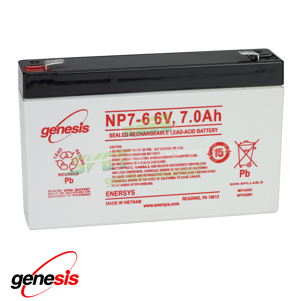 Koristeći najnovije tehnologije kompanija EnerSys (bivša Yuasa) su primenili svoje dugogodišnje iskustvo u polju olovno-kiselinskih baterija kako bi dizajnirali optimalni proizvod zapečaćenih olovno-kiselinskih baterija. Jedinstvena tehnologija konstrukcije ovih baterija sprečava bilo kakvo curenje elektrolita iz kućista ili terminala. Genesis SLA baterija 6V 7Ah oznake NP7-6 je punjiva olovna baterija bez tečnog elektrolita što u potpunosti eliminiše potrebu za održavanjem. Zahvaljujući visokoj gustini energije, Genesis olovne baterije su idealne za UPS uređaje, dečije igračke, osvetljenja, sisteme za obezbeđenje, kosačice, panik lampe, medicinske uređeje itd.