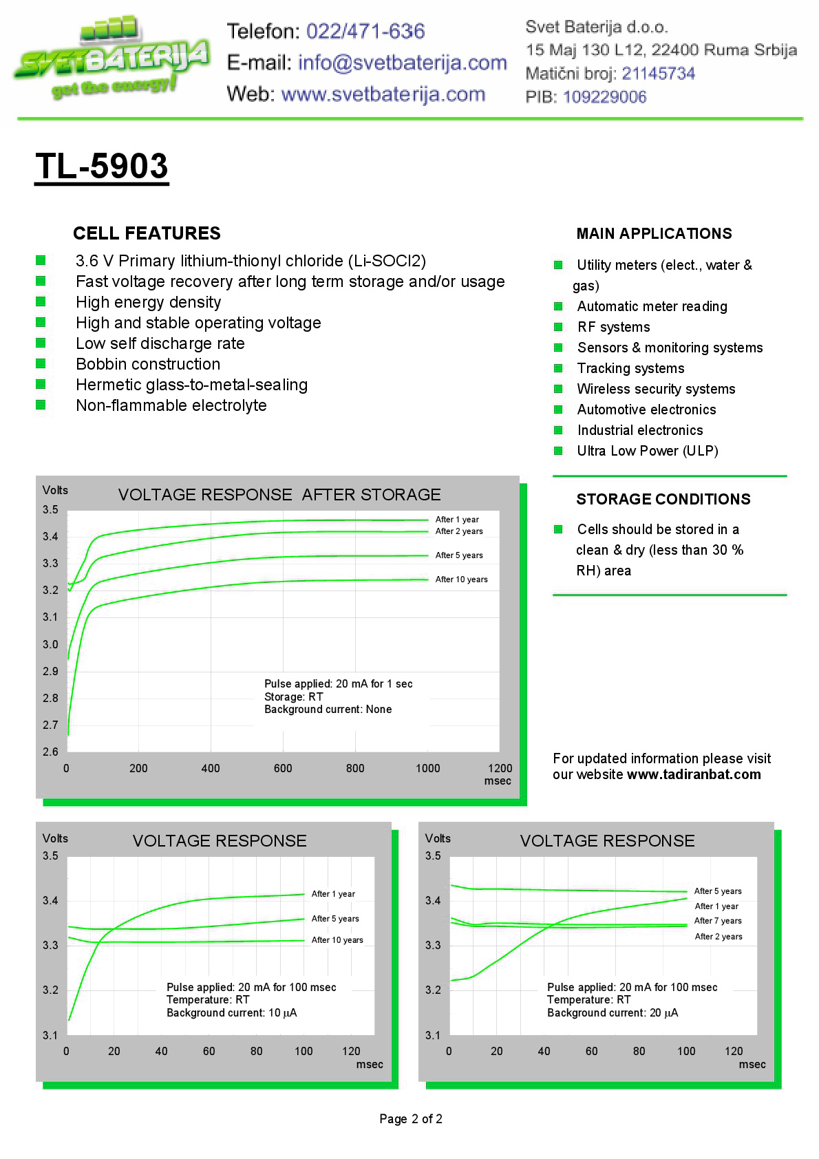 Koristi se kao napajanje memorije Back-up sistema, PLC, mernih uređaja, sigurnosnih sistema, senzora i druge profesionalne elektronike. Tadiran Lithium Thionyl Chloride (Li/SOCl2) baterija ima neverovatno stabilnu i dugotrajnu Litijum hemiju, kao i jedinstven napon od 3.6V za pouzdan izvor energije što je čini savršenom za specifičnu osetljivu elektroniku. Ova Tadiran TL-5903 baterija ima kapacitet od 2400mAh što srazmerno povećava njen radni vek posebno kod uređaja koji rade na niskoj impulsnoj struji. Veličina ćelije je AA ili 14500 i napravljena je da odgovara u unutrašnjosti kompaktne elektronike kojoj treba visok napon za brojila, čuvanje memorije i raznih mernih satova.