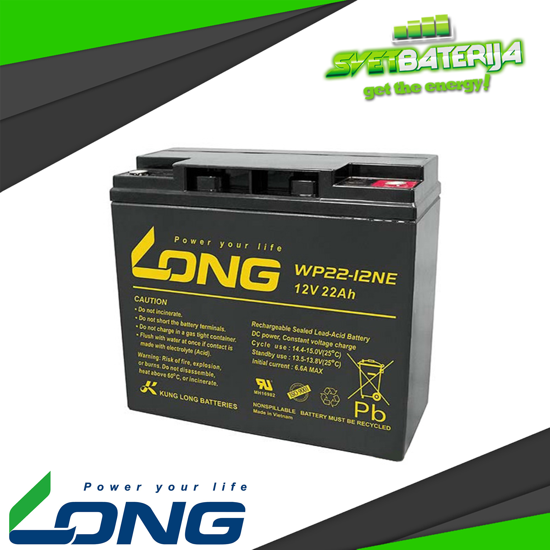 Kompanija Kung Long Batteries se bavi proizvodnjom i prodajom olovnih baterija na Tajvanu. Njihovi proizvodi obuhvataju AGM i Gel baterije, kao i druge tipove duboko cikličnih baterija. Long baterija 12V 22Ah pod oznakom WP22-12NE je specijalna baterija dimenzija 181x76x167 mm, koja za razliku od drugih baterija ovog napona i kapaciteta može da obezbedi veće struje pražnjenja. Ova baterija obezbeđuje i dug životni vek u uređajima kao što su alarmne centrale, reflektori, prskalice, kosačice, lampe i druge uređaje gde se traži suva baterija sličnih dimenzija ili karakteristika. Pored garancije od 12 meseci ističe se najbolji odnos cene i kvaliteta!