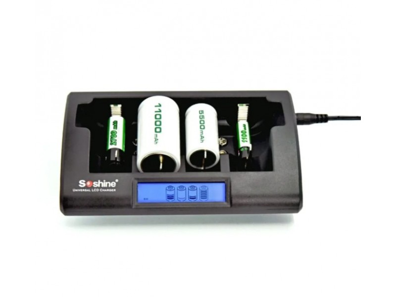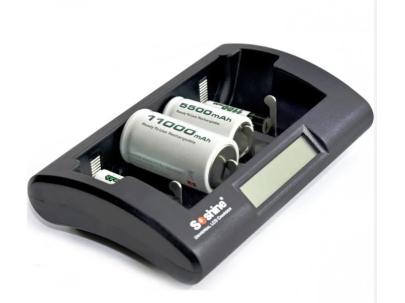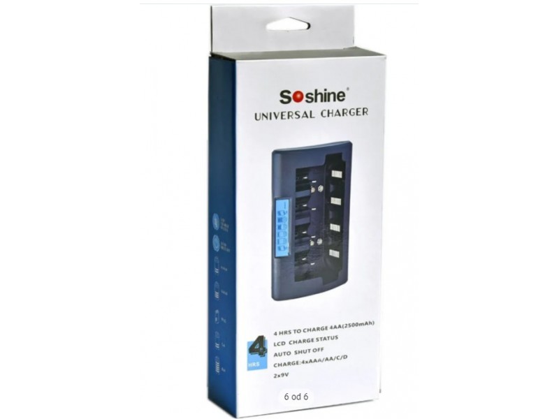 SOSHINE CD1 je kvalitetan punjač namenjen za punjenje 1.2V NiMh NiCD punjivih baterija dimenzija AA, AAA, C LR14, D LR20 i 9V Baterija (2 ležišta). Sa strujom punjenja do 800mA spada u kategoriju brzih punjača, standardne AA baterije puni za maksimalno 3h. Ima zaštitu od pregrevanja, automatski se gasi ukoliko temperatura komponenti dostigne 60 stepeni. Širok LCD prikaz statusa napunjenosti, napajanje sa utičnice ili autoupaljača na automobilu. Odlična kombinacija punjača za fotografe, snimatelje i muzičare!