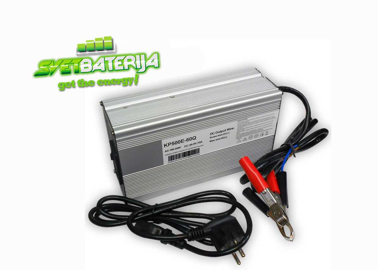 Punjač olovno hermetičkih akumulatora napona 48V maksimalnom strujom do 10A. Inteligentan punjač olovnih baterija za dečije igračke, trotiko i druga električna vozila, motocikle i automobile. Zaštita od obrnutog polariteta, zaštita od prepunjavanja. Ugrađen ventilator radi termoregulacije pri punjenju.