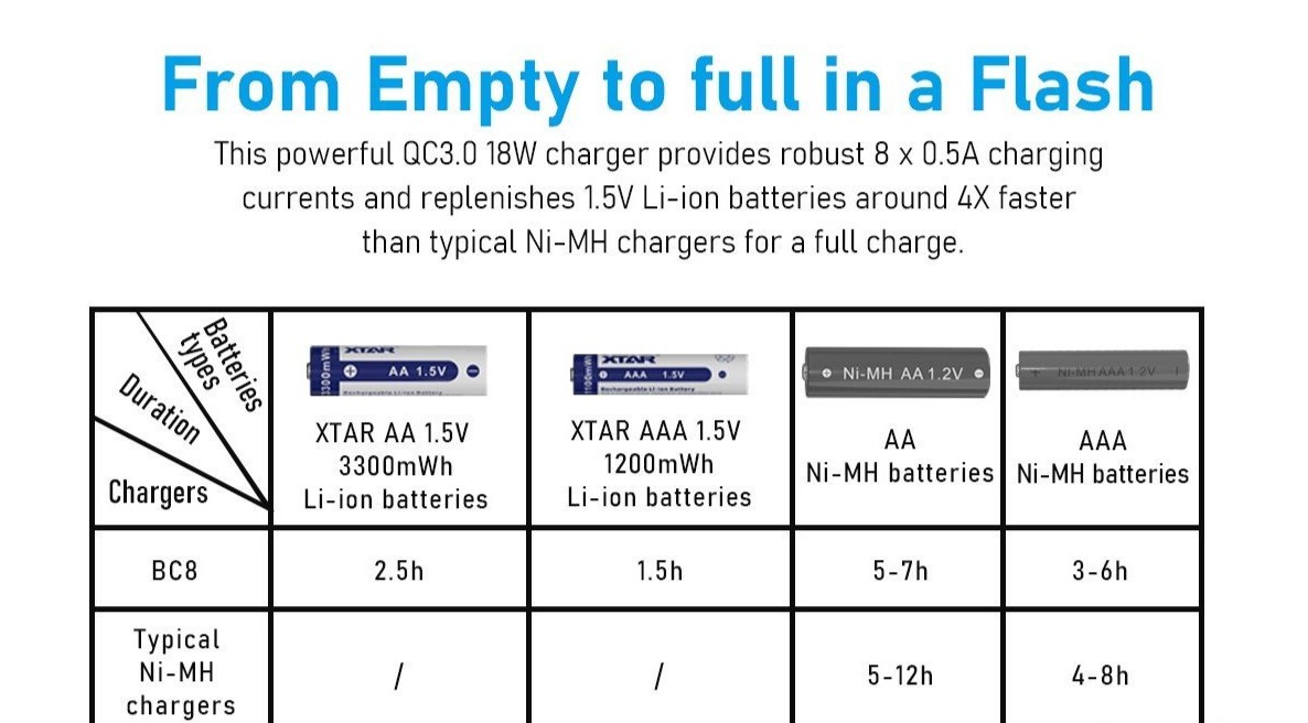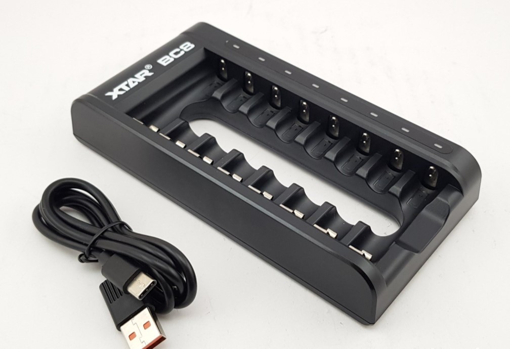 XTAR BC8 je idealna kombinacija mini punjača AA i AAA 1.2V NiMh/NiCd, 1.5V Li-Ion punjivih baterija. Inteligentan punjač koji automatski prepoznaje hemiju baterije i pronalazi odgovarajuću struju/napon punjenja a potom svako ležište je nezavisno od drugog što pruža mogućnost istovremenog punjenja litijum i nimh baterija. Idealan za korisnike snimača govora, mikrofona, fotoaparata i sličnih uređaja koji imaju zahtevnu potrošnju AA/AAA baterija. Velika prednost je USB C ulaz samim tim možemo da puni bilo gde na USB kabl koji dolazi u paketu. Integrisane sigurnosne mere protiv prepunjavanja, kratkog spoja i obrnutog polariteta.